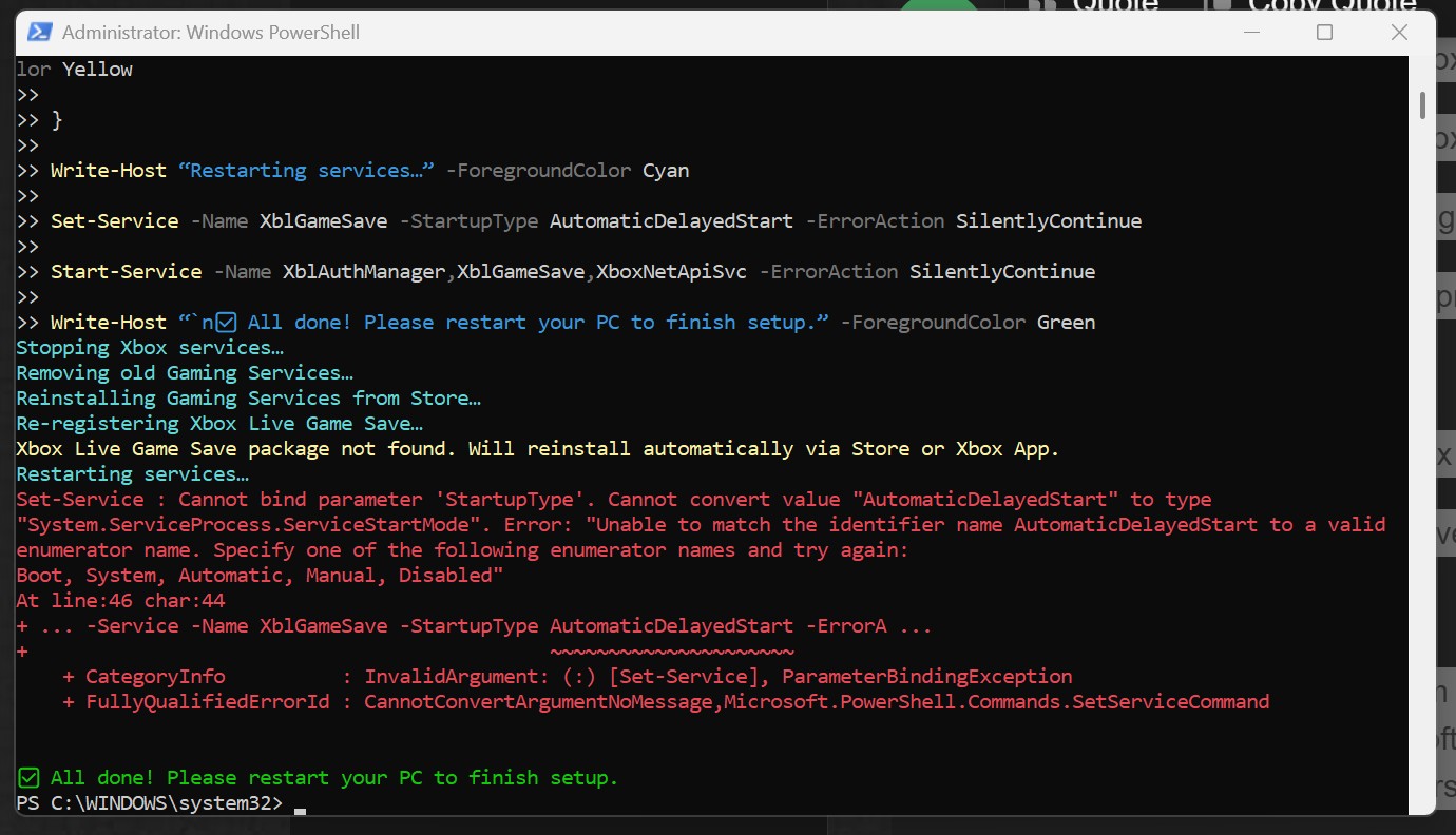 Write-Host “Reinstalling Gaming Services from Store…” -ForegroundColor Cyan