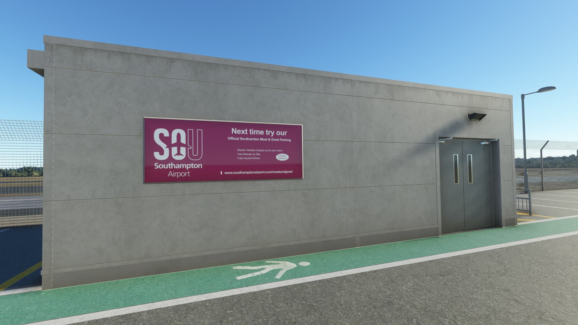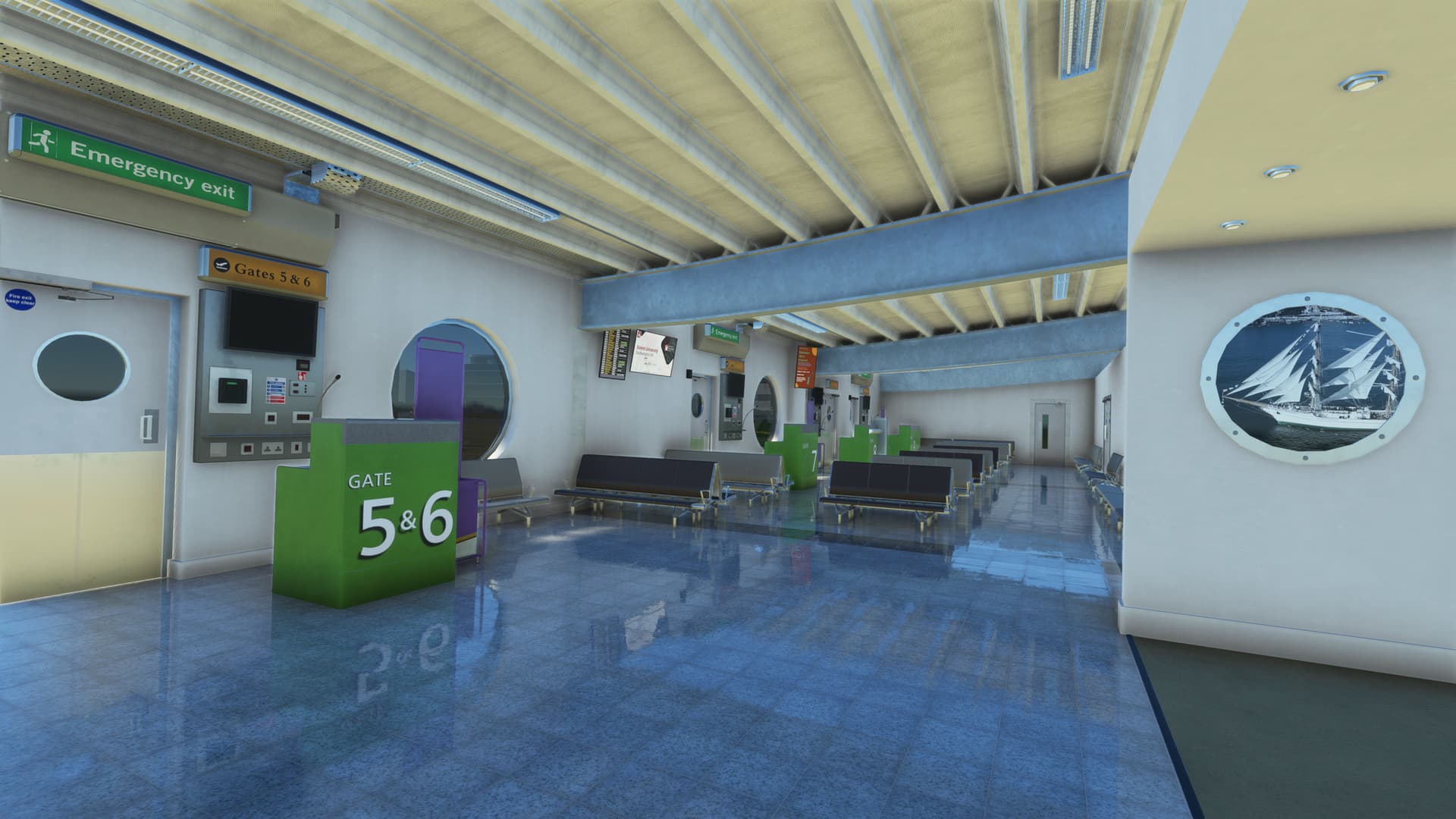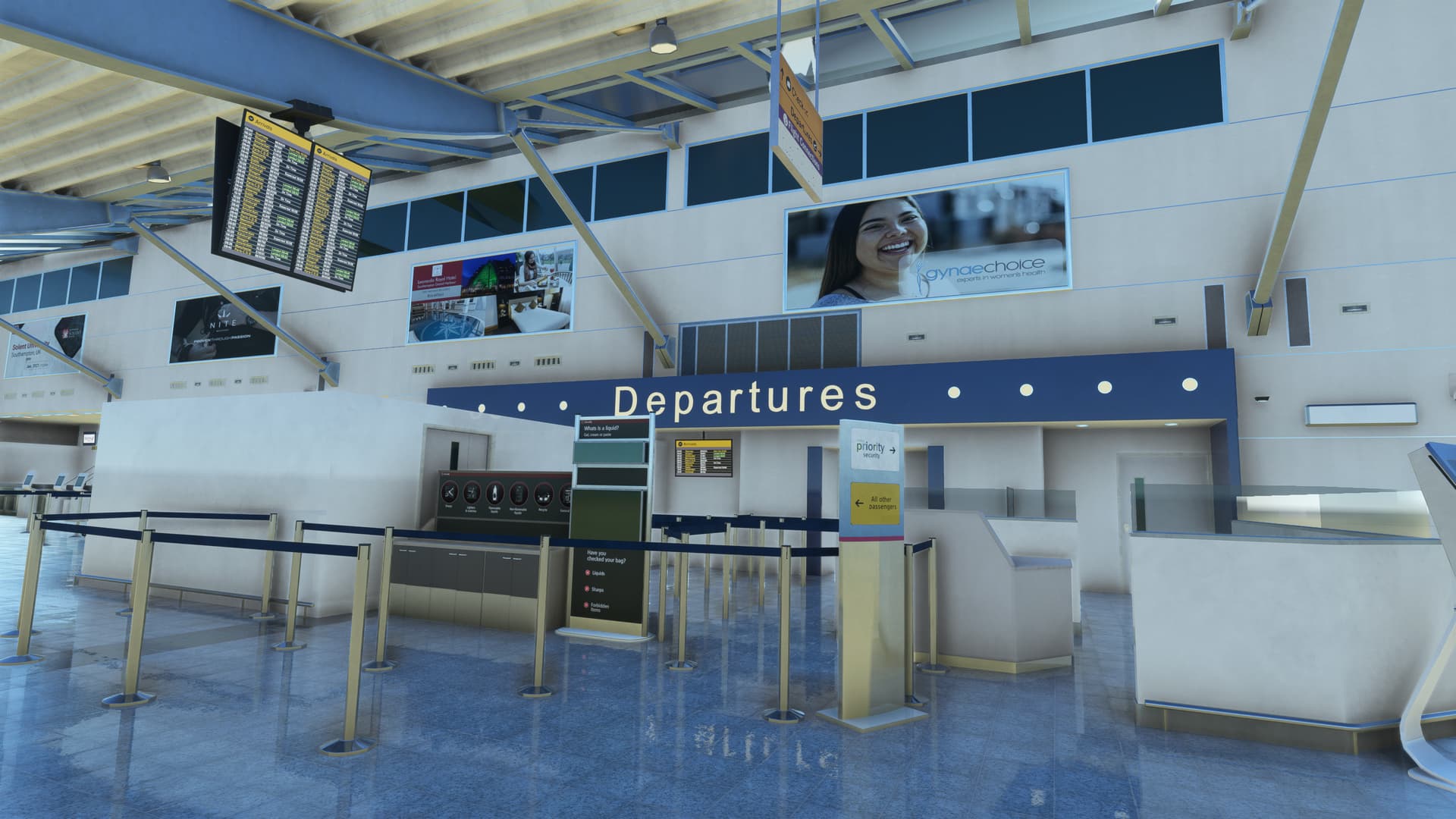 I started to tentatively explore my aircraft’s immediate surroundings, instantly impressed by the level of detail. EGHI is quite unique in that its apron is built with paving brick, giving it a very unusual appearance — and Ini have captured the effect superbly. Next, I came upon the entrance doors to the terminal. Would there be anything inside? You bet — the full PC interior, in very high-res! There’s nothing they haven’t modelled here — every sign, every check-in desk, every fire extinguisher, every door handle, every poster, every seat, every window, every ceiling light, every floor panel…