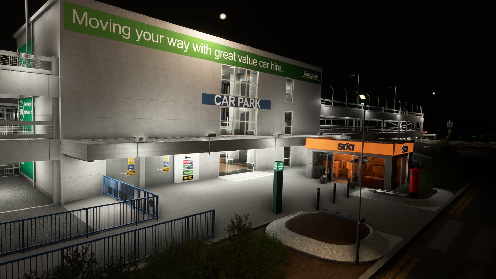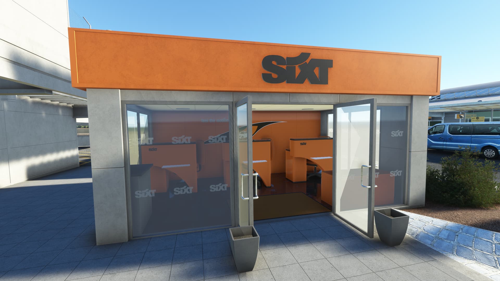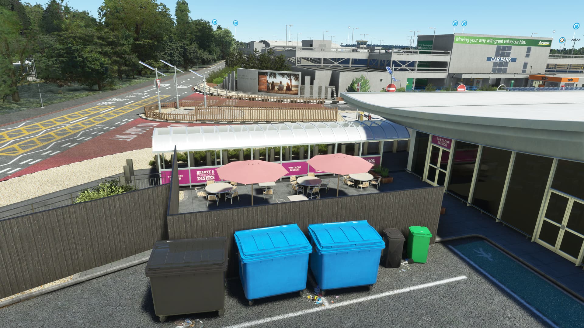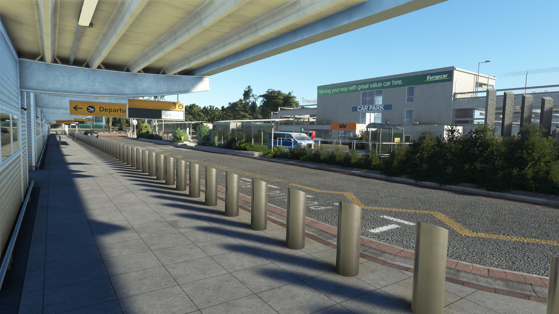 I started to tentatively explore my aircraft’s immediate surroundings, instantly impressed by the level of detail. EGHI is quite unique in that its apron is built with paving brick, giving it a very unusual appearance — and Ini have captured the effect superbly. Next, I came upon the entrance doors to the terminal. Would there be anything inside? You bet — the full PC interior, in very high-res! There’s nothing they haven’t modelled here — every sign, every check-in desk, every fire extinguisher, every door handle, every poster, every seat, every window, every ceiling light, every floor panel…