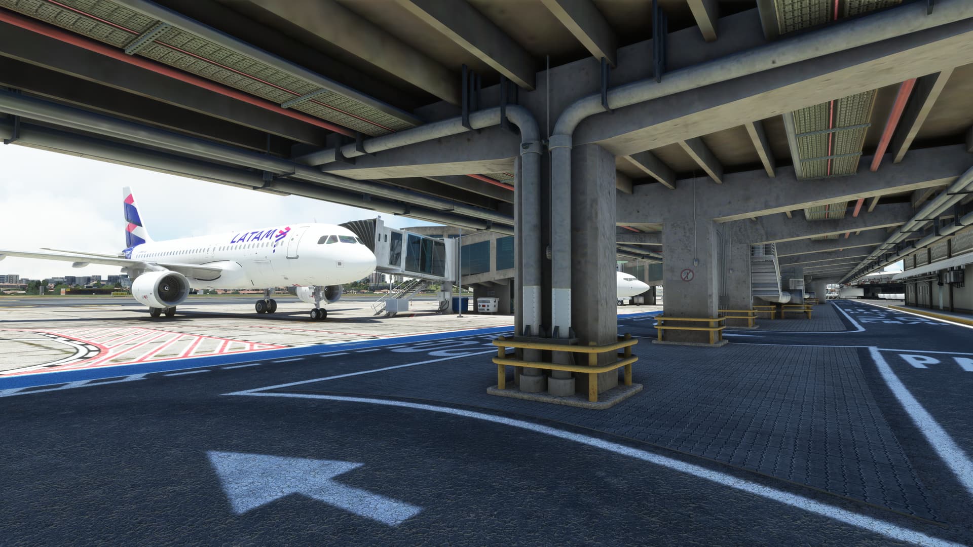 The terminal building looks amazing! An incredibly ugly, mostly concrete structure, it really feels grimy and worn! Paulo’s not only included but nicely detailed all the dingy cracks and crevices (i.e. the parts passengers rarely see) and it really makes this airport feel authentic. We are treated to a partial interior too — not quite up to the standard of Viracopos but still very well done — however I can’t help but feel such a feature subtracts far more from this scenery than it adds (more about that later). Like Viracopos there are no passengers, static or otherwise.