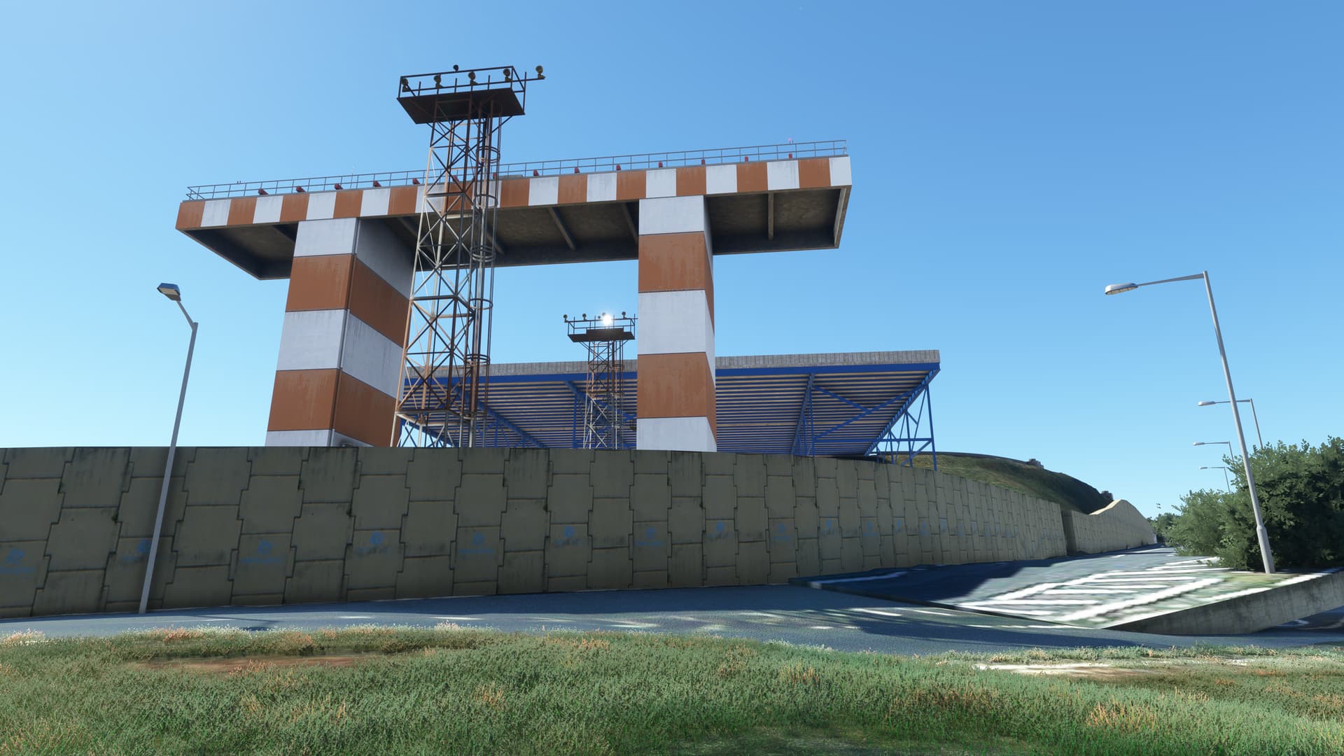 The whole airfield perimeter looks very good, if you can excuse some of the low-res ground textures. There are some great little details, such as a variety of electricity pylons, the larger examples featuring those garish plastic spheres attached to their lines to make them visible to low-flying manned or unmanned aircraft (including drones and kites). The custom runway approach lighting is excellent and all the surrounding roads have modelled streetlights — although at night you do see way too many Asobo ‘globes’! Paulo’s even modelled a golf course and what appears to be a memorial park at the runway 35 end of the field. To add extra shine, we get some really good terraforming across the entire airport.