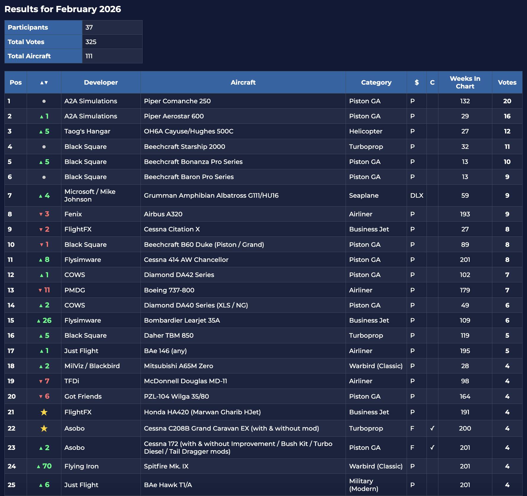 February Top 25 Aircraft