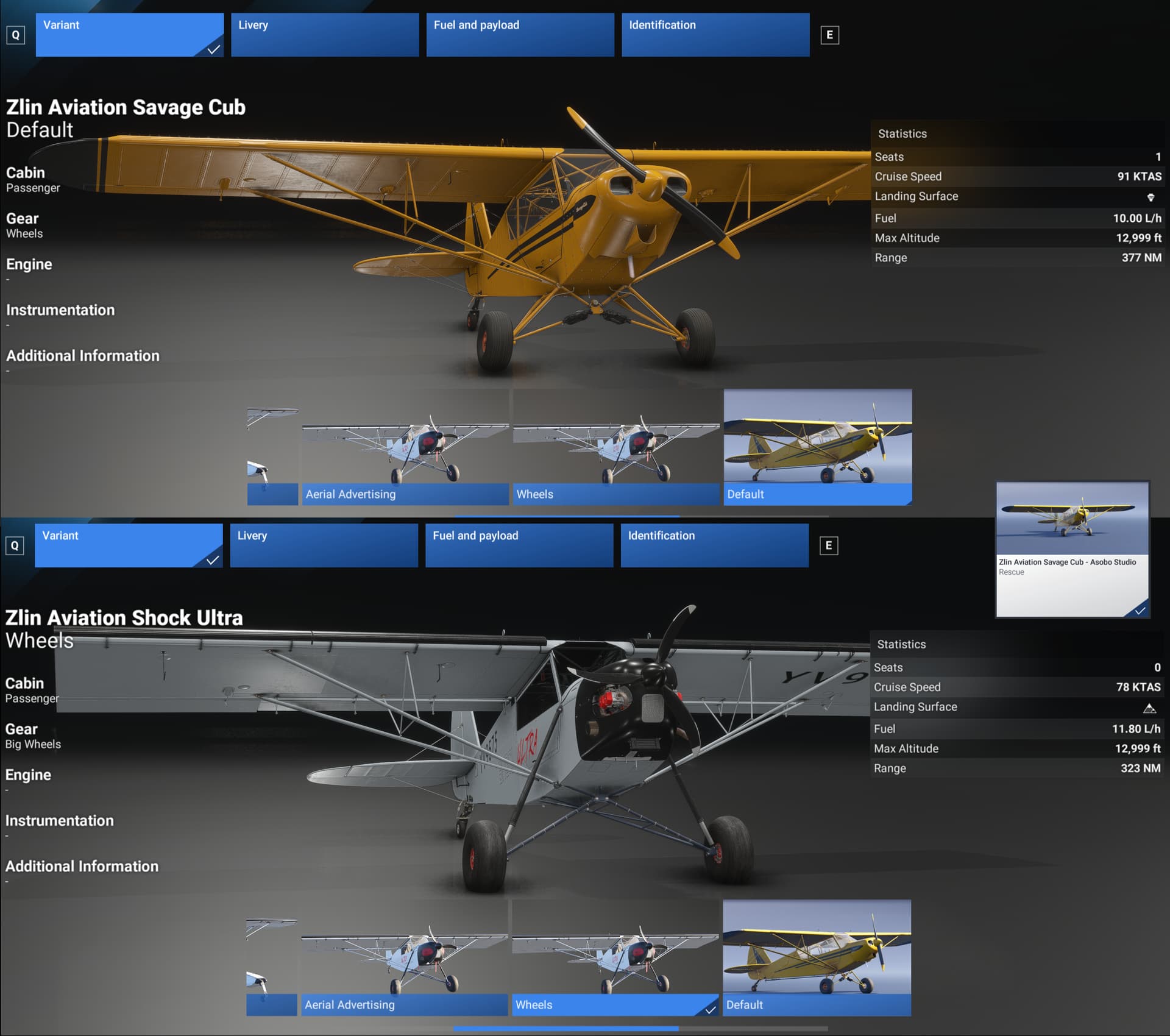 • Zlin Aviation Savage Cub and Zlin Aviation Shock Ultra need to be listed as two individual Aircraft, not Variants. In Version 1.3.25.0 01 the two are listed as Variants of the Zlin Aviation Savage Cub - Rescue Variant.